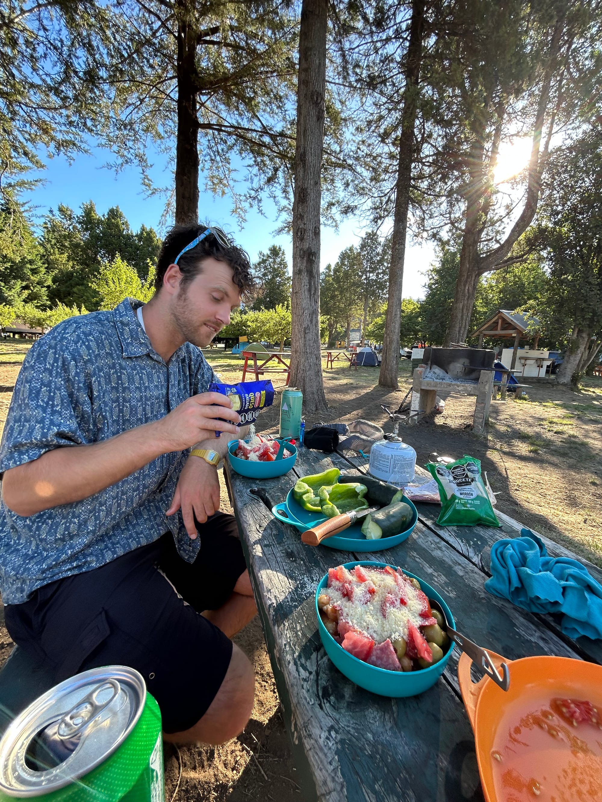 We cooked a cheap meal for dinner that night which had a bunch of random stuff like gnocchi, bolognese sauce, tomatoes, cheese, olives, and salami. Our plan was to cook on one of the BBQ’s at the campsite, however, we struggled to find wood to fuel it. Nonetheless, we were satisfied with the dish.