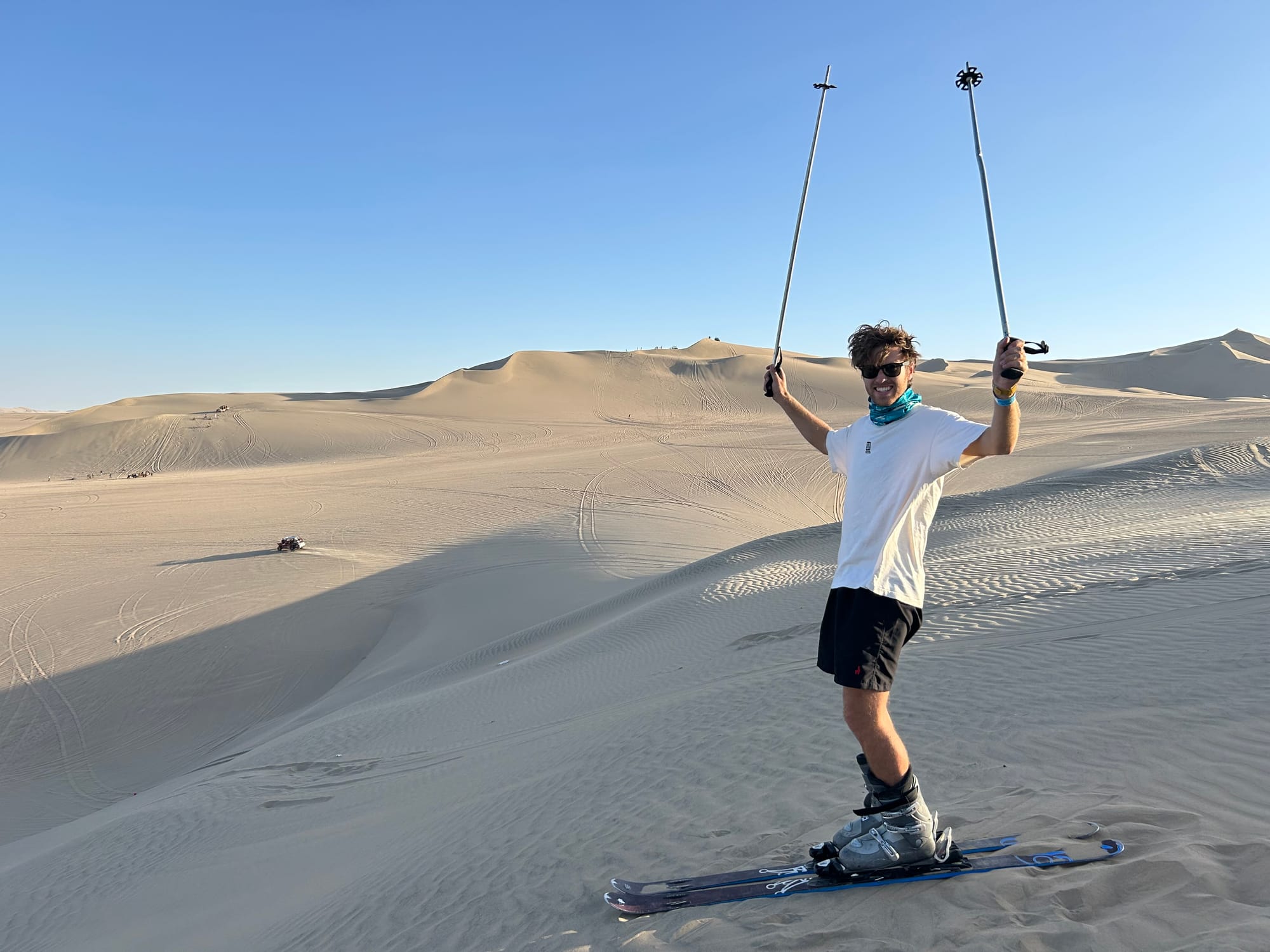 Then it was time to start skiing down the hill which did not get off to the best start, in fact I almost had a little cry haha. I don’t think I quite expected to be so freaked out about re-injuring my knee (first time back into sport in 2 years). Firstly, skiing on sand is quite hard, it’s very resistive so you actually need a bit of speed to be able to turn. The first slope we went down I was too scared to try my first turn so ended up just sidling down it. Bit embarrassing, but by the 3rd run I was into the swing of things thankfully. Lucas of course made it look super easy from the get go.