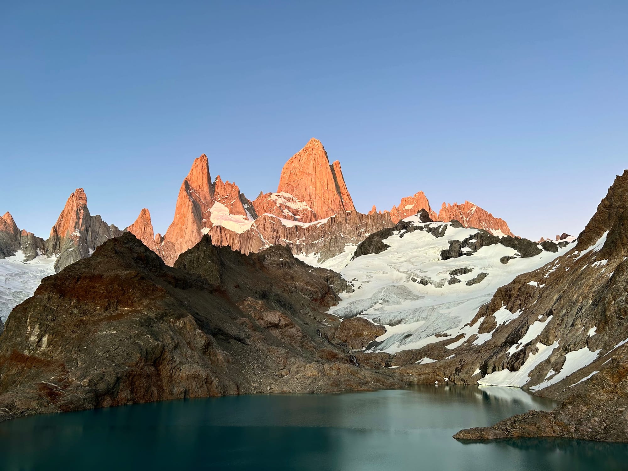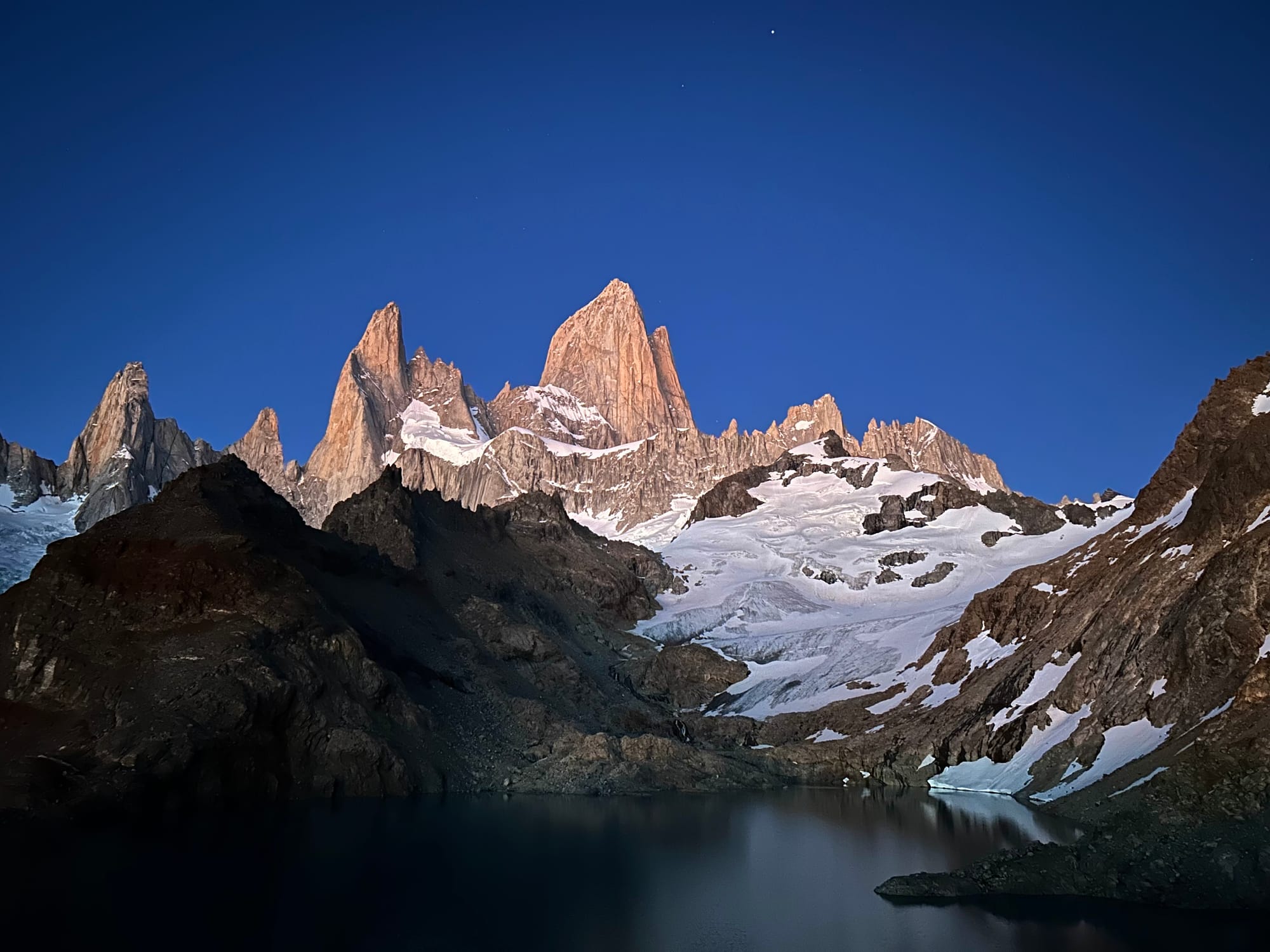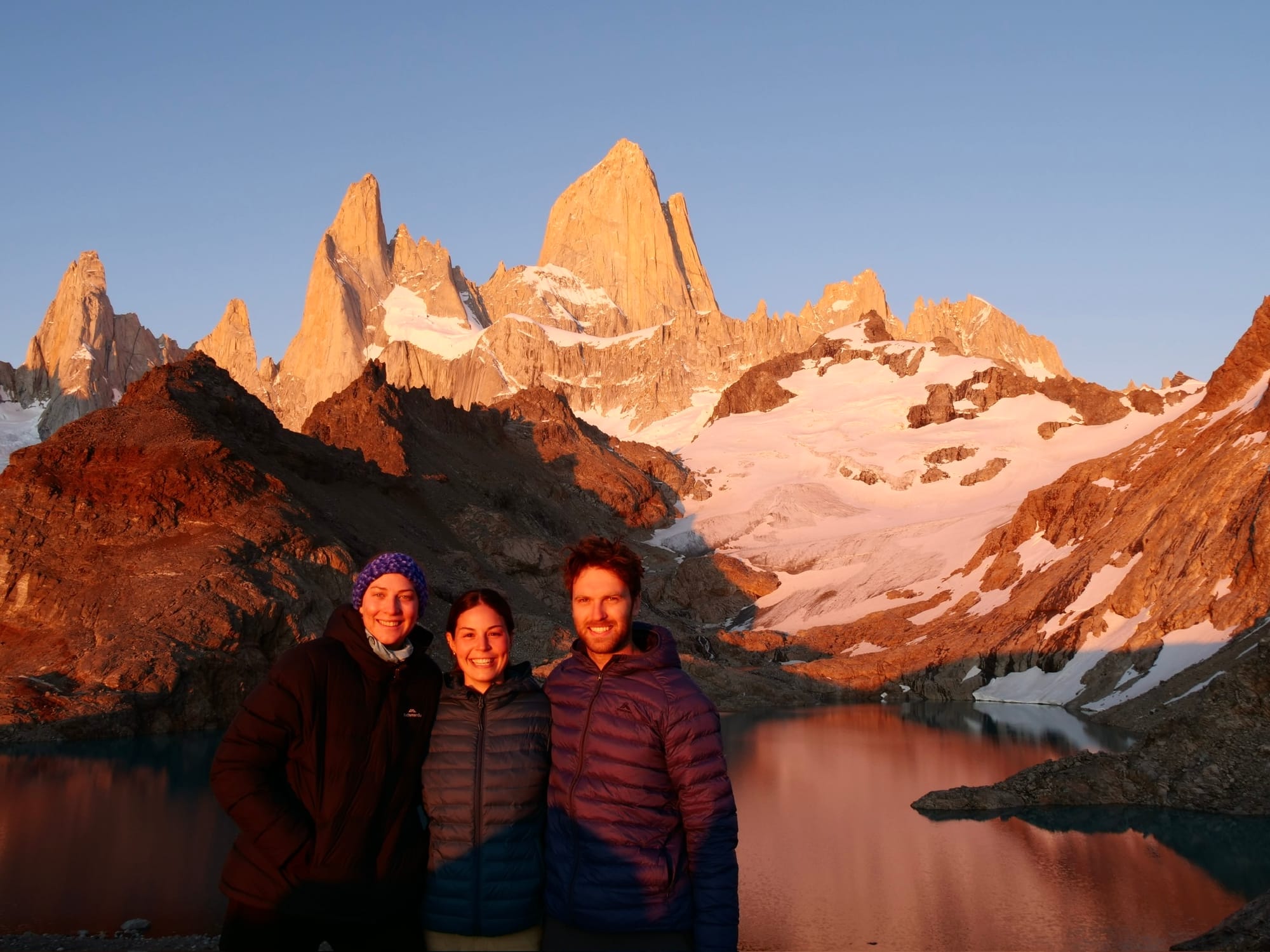 On day 3 we started walking at 3am to get to the Mt Fitzroy viewpoint for sunrise. We got there with about an hour to spare but at least we were prepared. We had warm clothes, though nothing could’ve prepared us for how cold that wait in the dark was. We stayed up there for a couple hours all up, taking in all the different stages of the sun on Mt Fitzroy. We also got to share the moment with Sophie who was also up there for sunrise. We left her up there as she went and found a patch of grass for a quick nap.