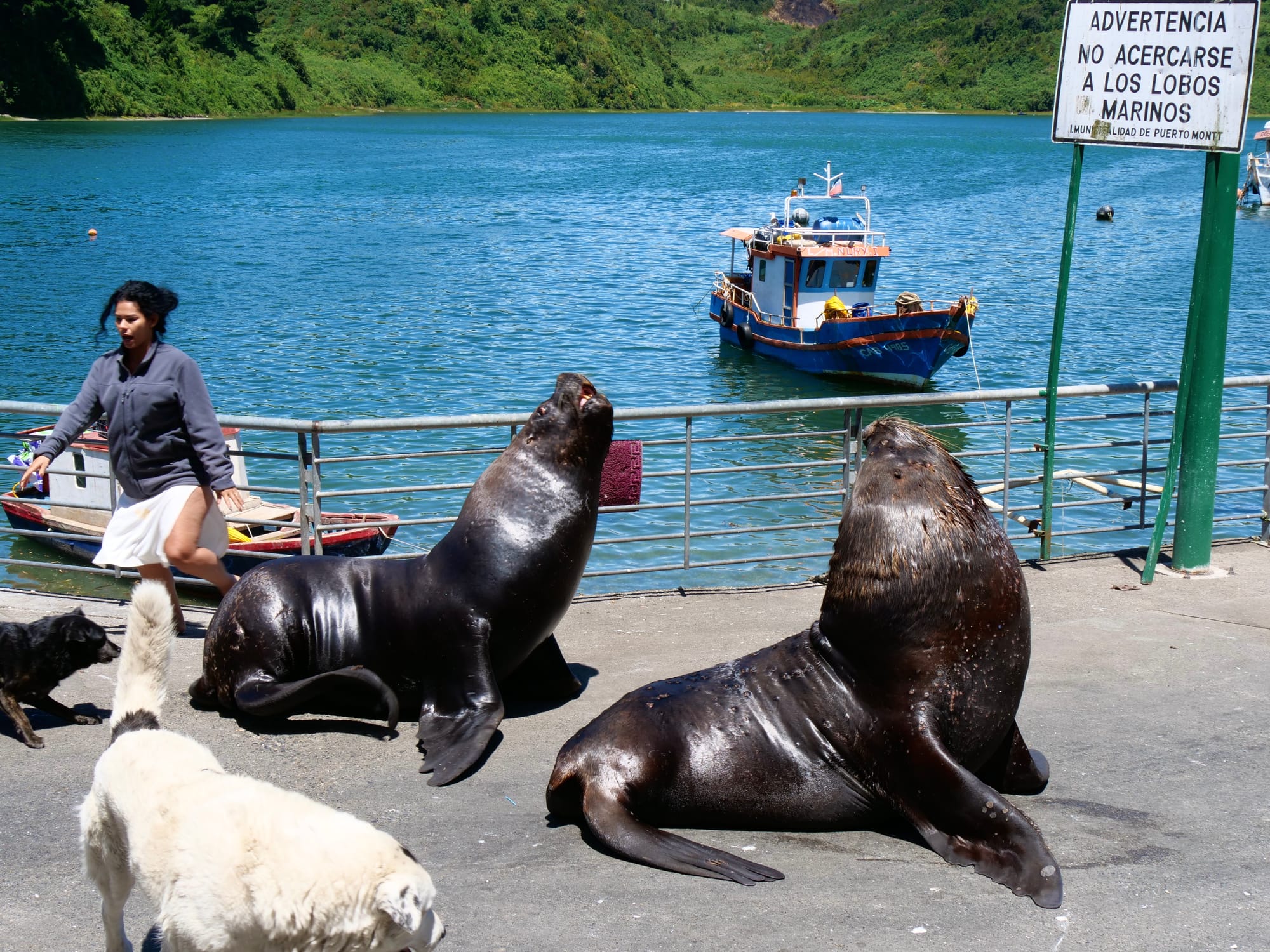 From town we walked along the waterfront to Angelmo, a market area with knitted clothing, wooden goods, and seafood. A lot of seafood. We didn’t buy any seafood though as we were still full from our big brunch. Also attracted to Angelmo, most probably for the seafood, was the sea lions!