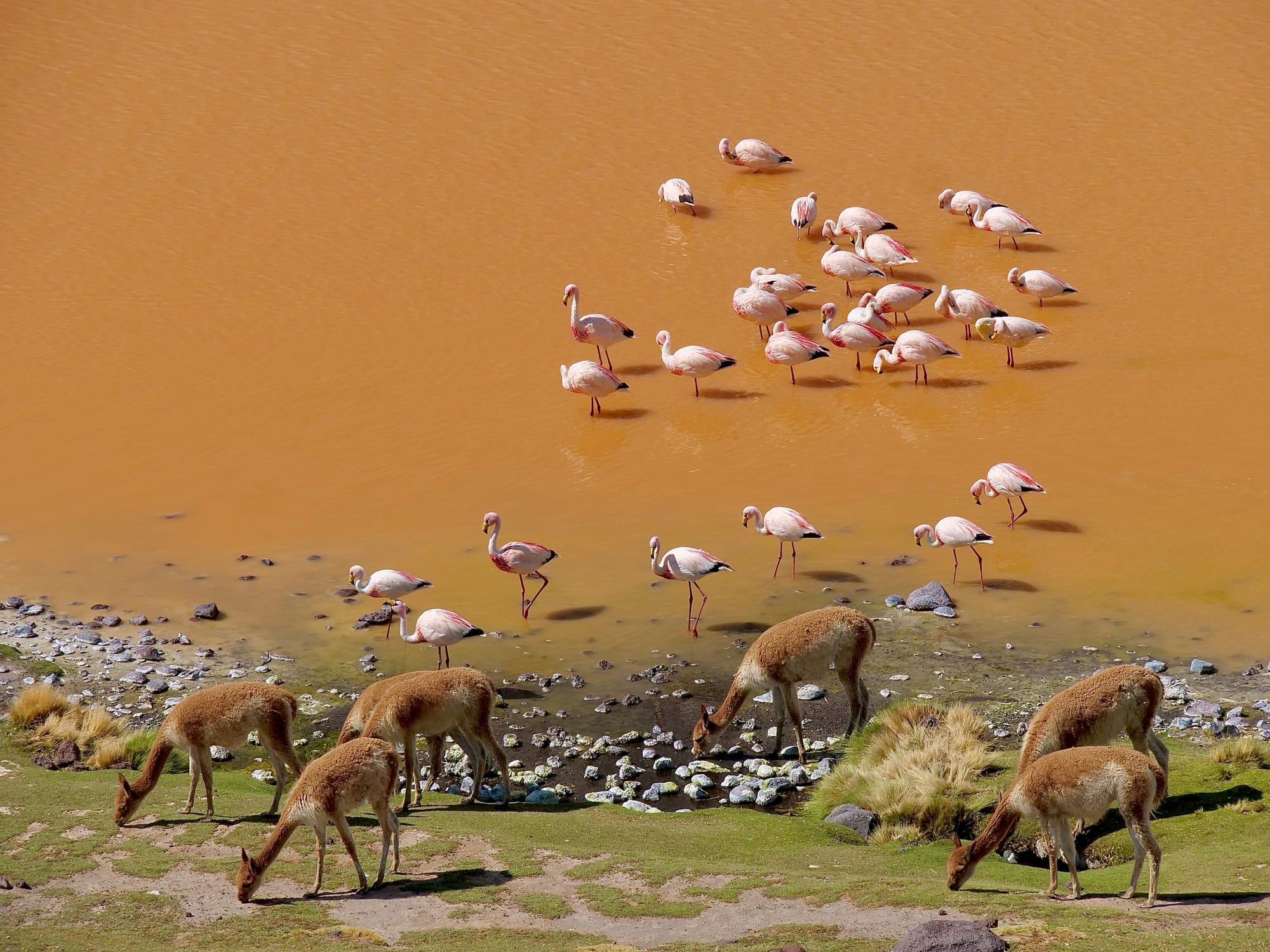 We stopped at hot springs, geysers, and many lagunas, including our last stop which was laguna Colorada. The hot springs were a lovely way to warm up after the cold morning. The geysers weren’t quite as exciting as El Tatio Geysers in Chile, but they definitely smelt like Rotorua. Laguna Colorada is known for its pink flamingos, and it certainly lived up to the expectation. There would have been thousands of them. It was also the first time we saw Llamas up close which was cool. The Llamas in Bolivia are owned by farmers, even though they roam wild. How they tell them apart I have no idea, perhaps the colourful tassels they have on their ears and necks?