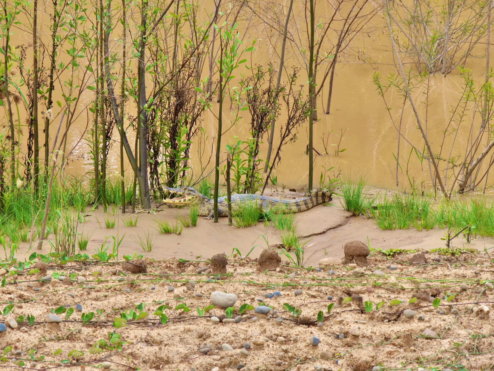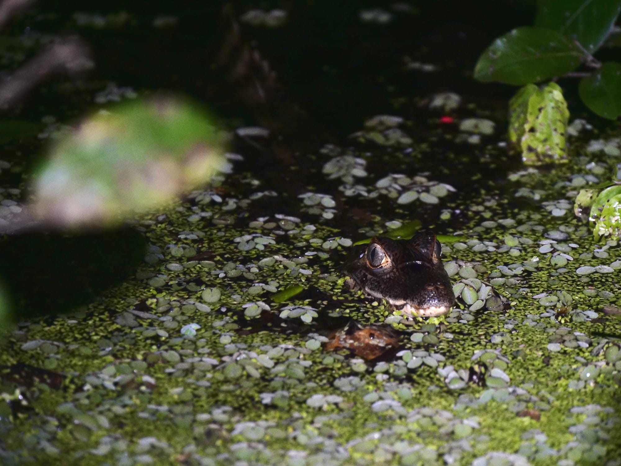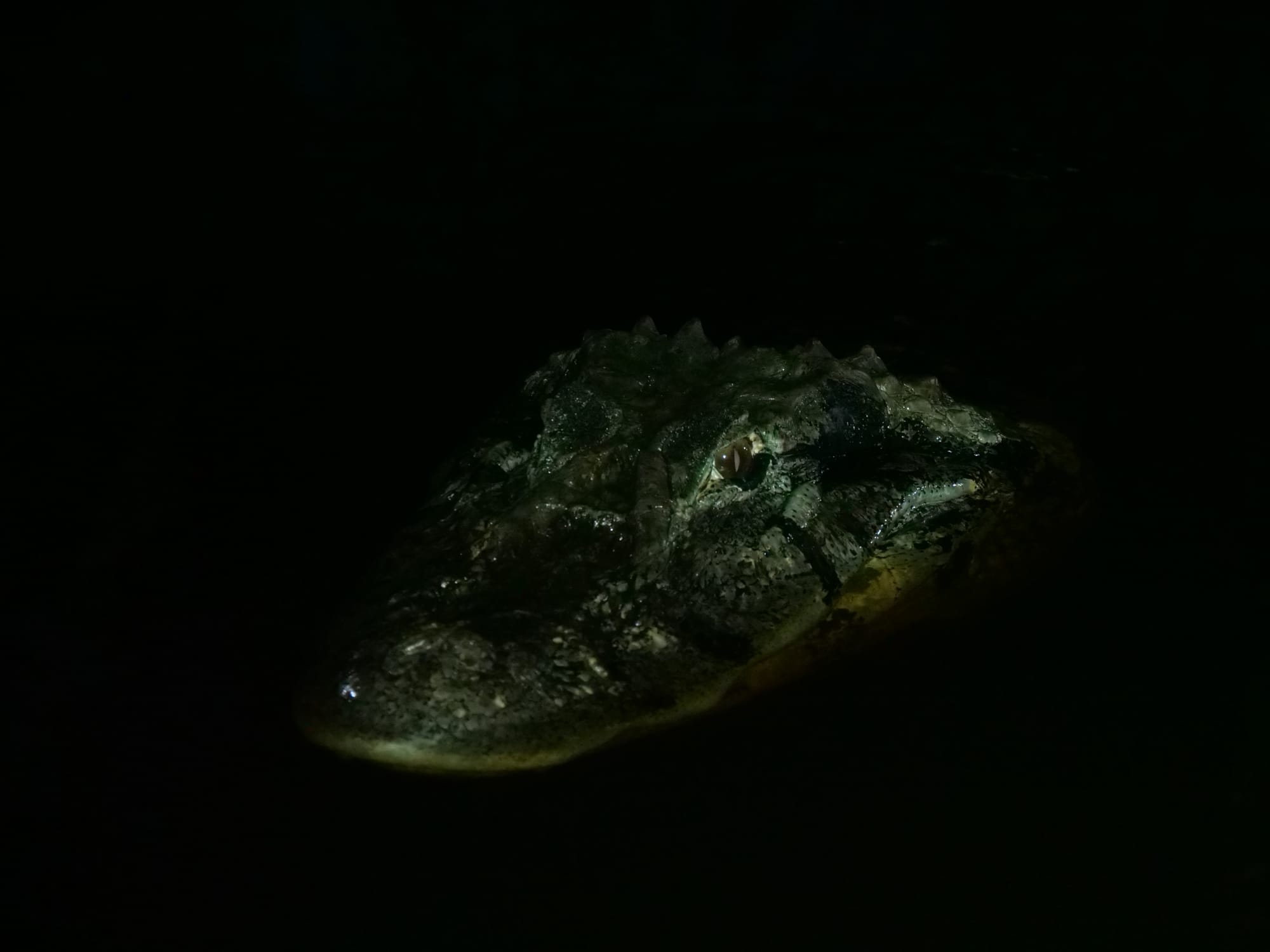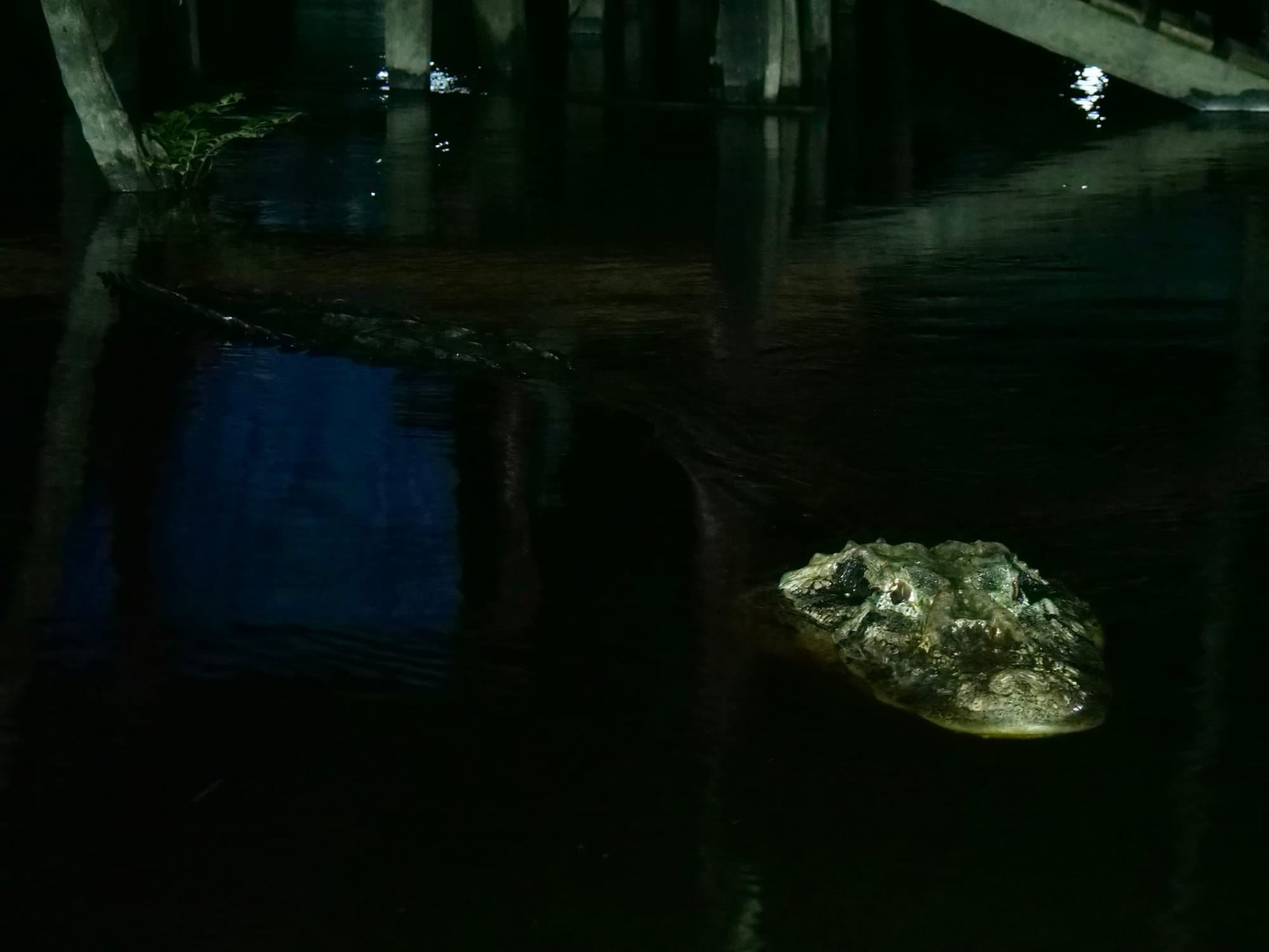 We eventually made it to our accomodation which was an assortment of wooden buildings on stilts with raised walkways between them. After a very brief stop to offload our cargo, we set out again as the sun set to spot some alligators and cayman. The best viewings though proved to be right under our feet at the accomodation.
