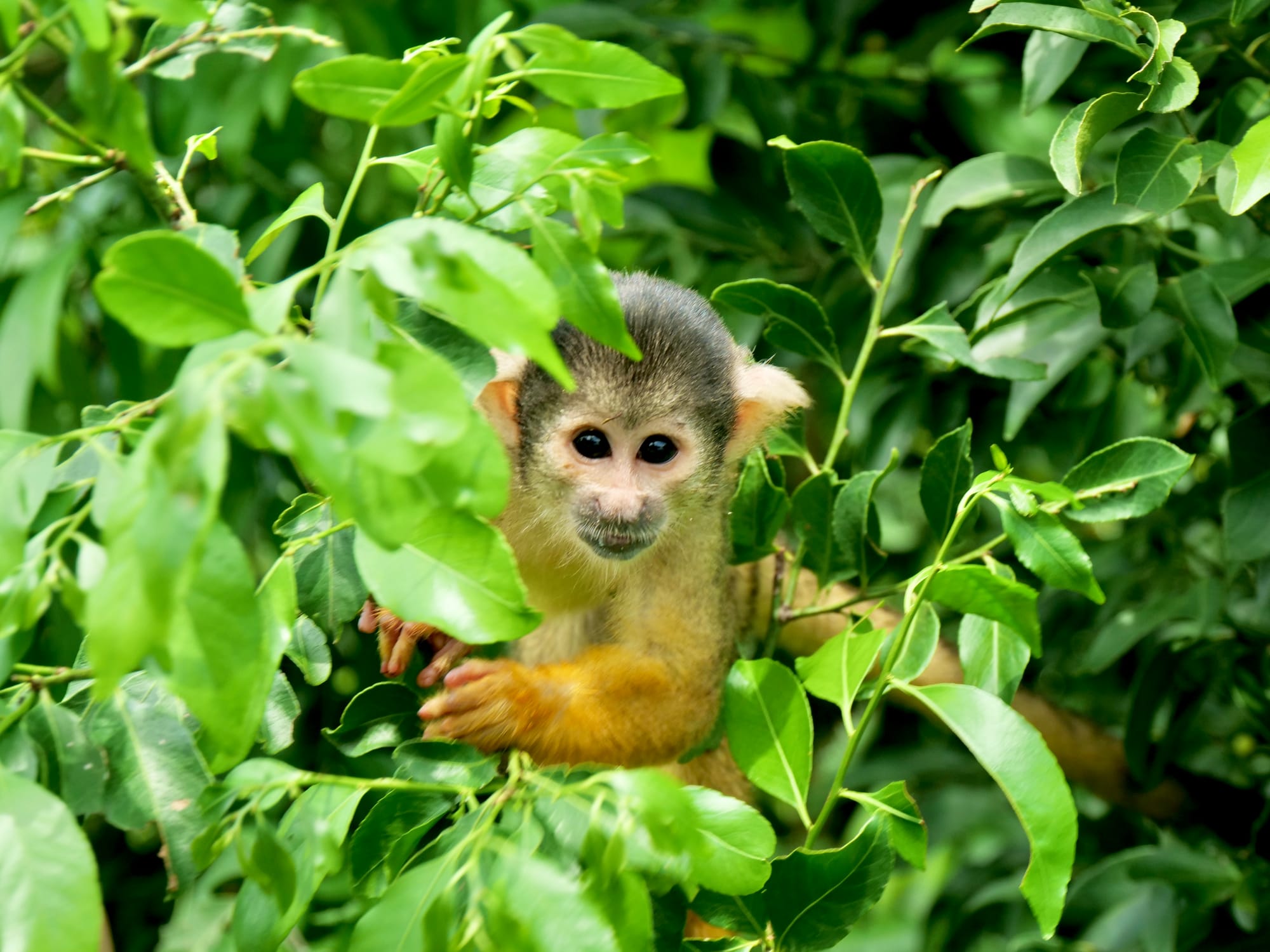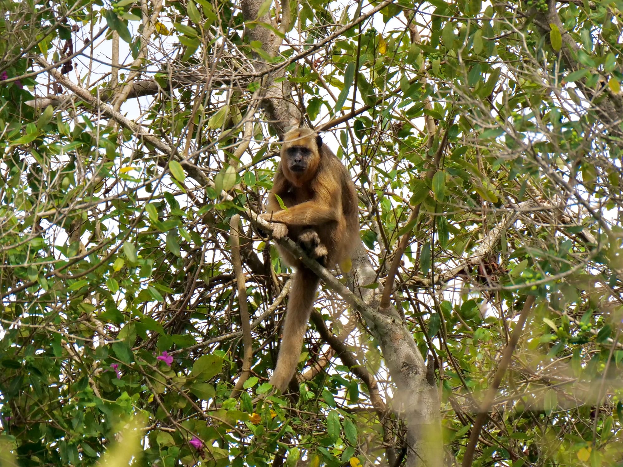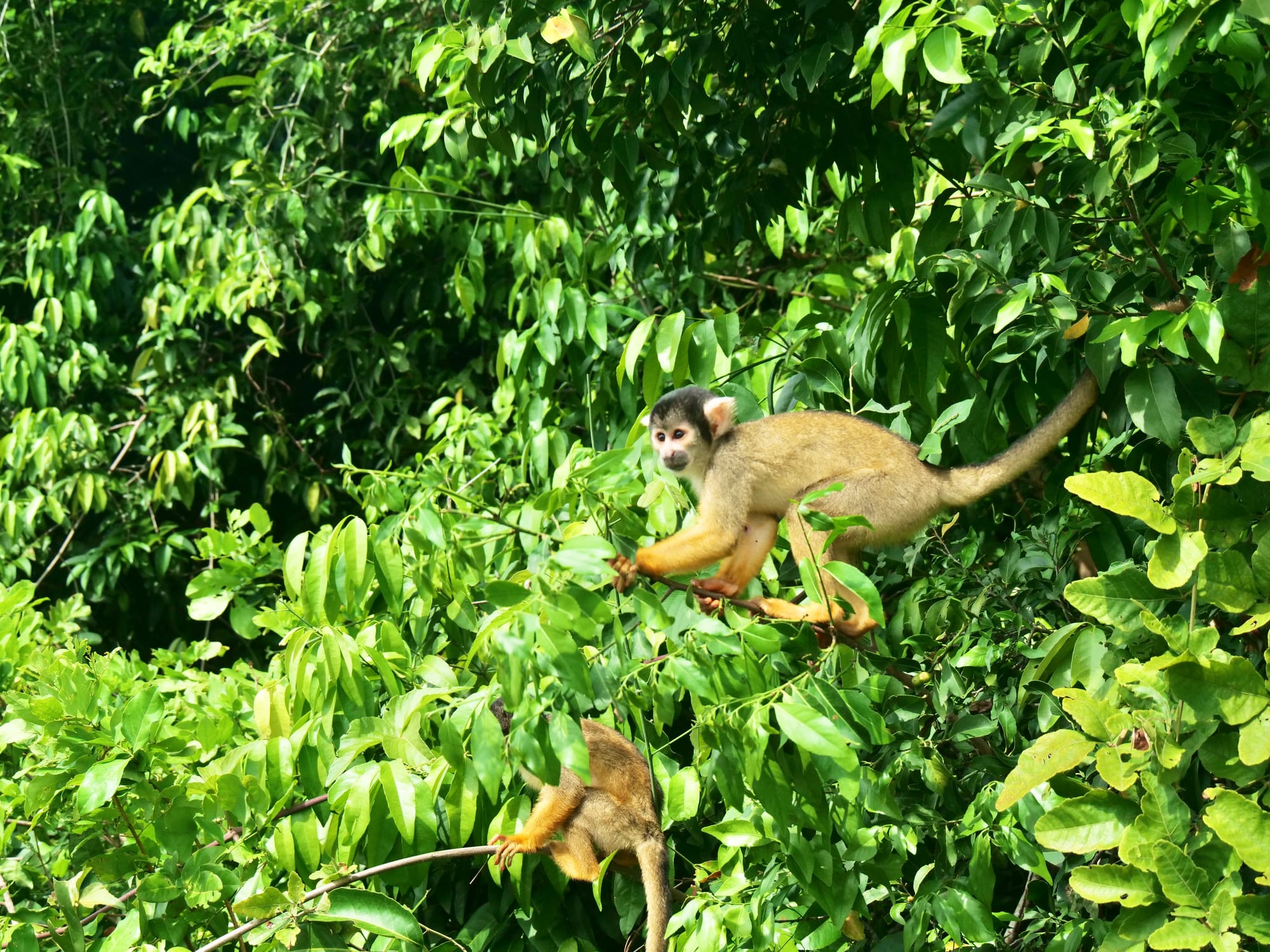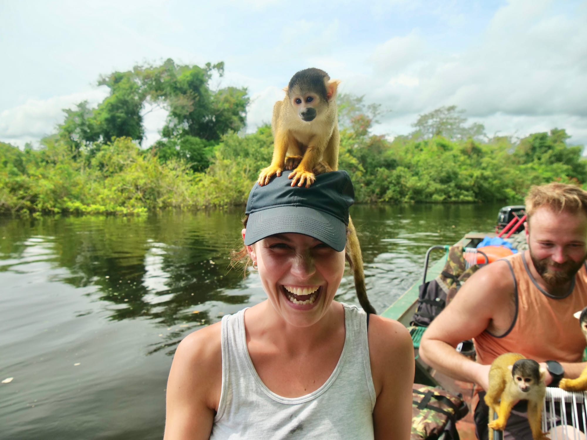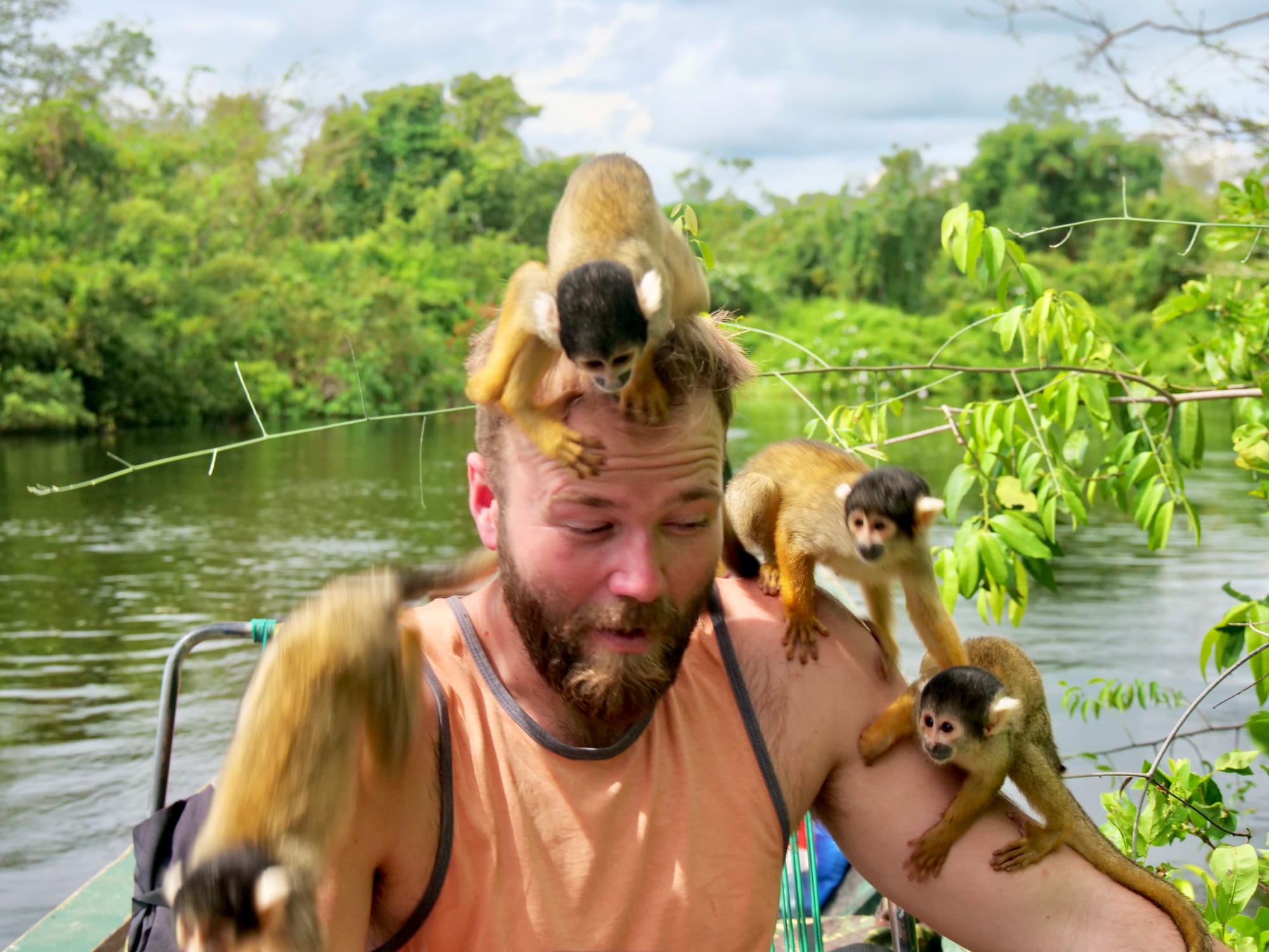 Halfway along the journey to our accomodation, Jaky spotted some monos amarillas (yellow monkeys) and steered our boat towards them and into the bush. Soon enough we had monkeys all over us and the boat.