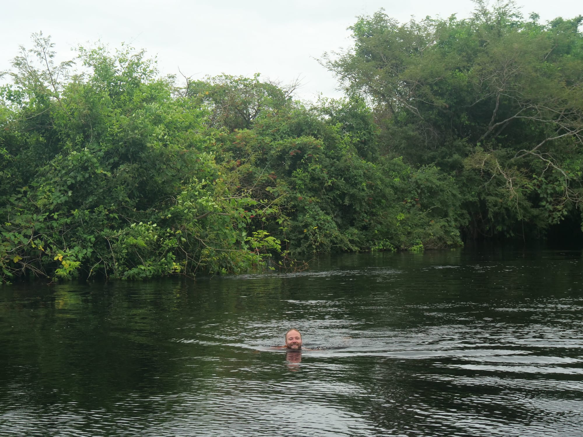 Our second spot was significantly less secluded being right in the main river with a lodge next to us which seemed a prime spot for caymans and alligators to live. Again Jaky insisted it was safe and with more dolphins around us here Ads and I took another leap into the dark but warm water.